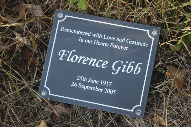 Memorial plaque made from corian.  Corian is a man made material that is excellent for memorial plaques.  It is strong and cold to touch like granite/stone but has the advantage of being consistent with no variation in composition, flaws, cracks etc.