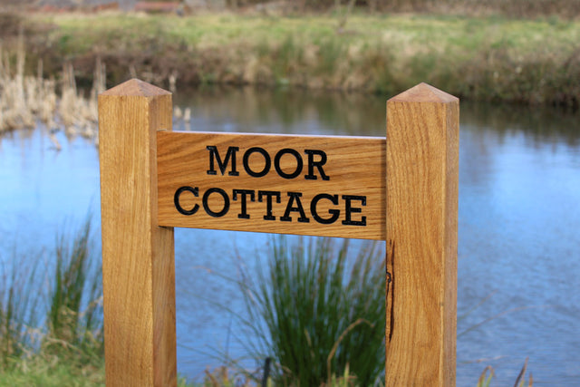 Wooden sign mounted on oak supporting posts. Suitable for being carved on both sign faces. Signs are morticed into the accompanying posts for a lasting finish (shipped loose with instructions for assembly).